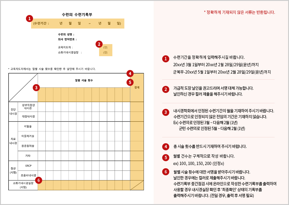 접수 전 제출서류 (수련증명서, 수련기록부, 지도의추천서) 작성 방식은 아래 예시를 참고하여 주시기 바랍니다.